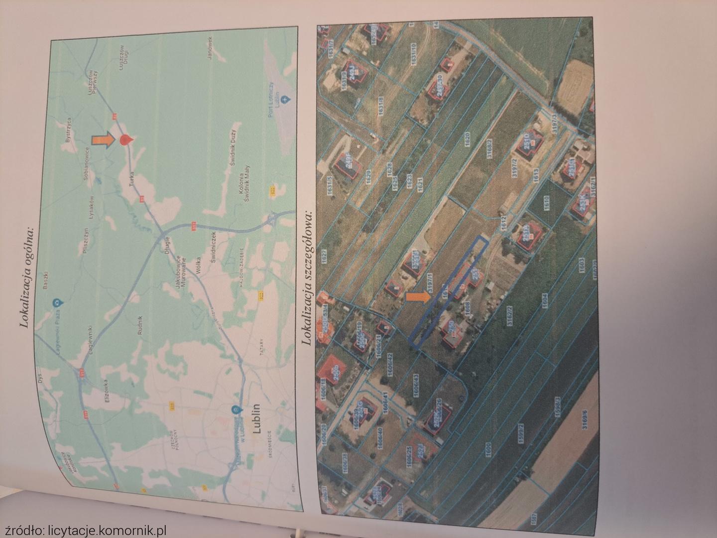 ...pierwsza licytacja nieruchomości gruntowej - działka ewid. nr 192 (łąki, pow. 0,0200ha) oraz działka ewid. nr 822 (las, pow. 0,0800ha) położonej: 20-258 Wólka, Turka, dla której Sąd Rejonowy Lublin-Wschód w Lublinie z/s w Świdniku V Wydział Ksiąg Wieczystych prowadzi księgę wieczystą o numerze KW ***, stanowiącej własność dłużniczki ***. Nieruchomość gruntowa składająca się z dwóch działek gruntu – nr ew. 192 oraz 822, położona w obszarze gminy Wólka w miejscowości Turka. Łączna powierzchnia...