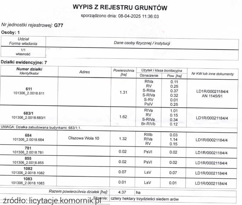...pierwsza licytacja nieruchomości należącej do dłużnika: ***, położonej przy Annosław ***, 96-232 Regnów, dla której Wydział Ksiąg Wieczystych Sądu Rejonowego w Rawie Maz. prowadzi księgę wieczystą o numerze LD1R/***/7. |