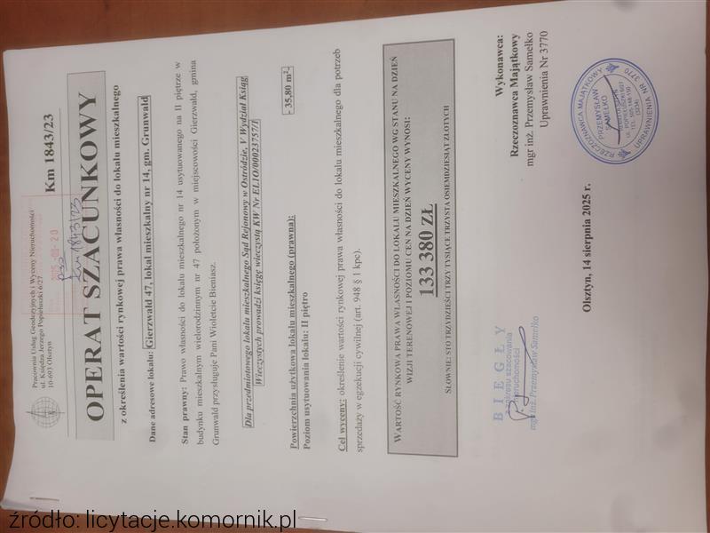 ...pierwsza licytacja lokalu mieszkalnego należącego do dłużnika: ***, położonego przy ul. Gierzwałd ***/***, 14-107 Gierzwałd, dla którego Sąd Rejonowy w Ostródzie V Wydział Ksiąg Wieczystych prowadzi księgę wieczystą o numerze ***. |